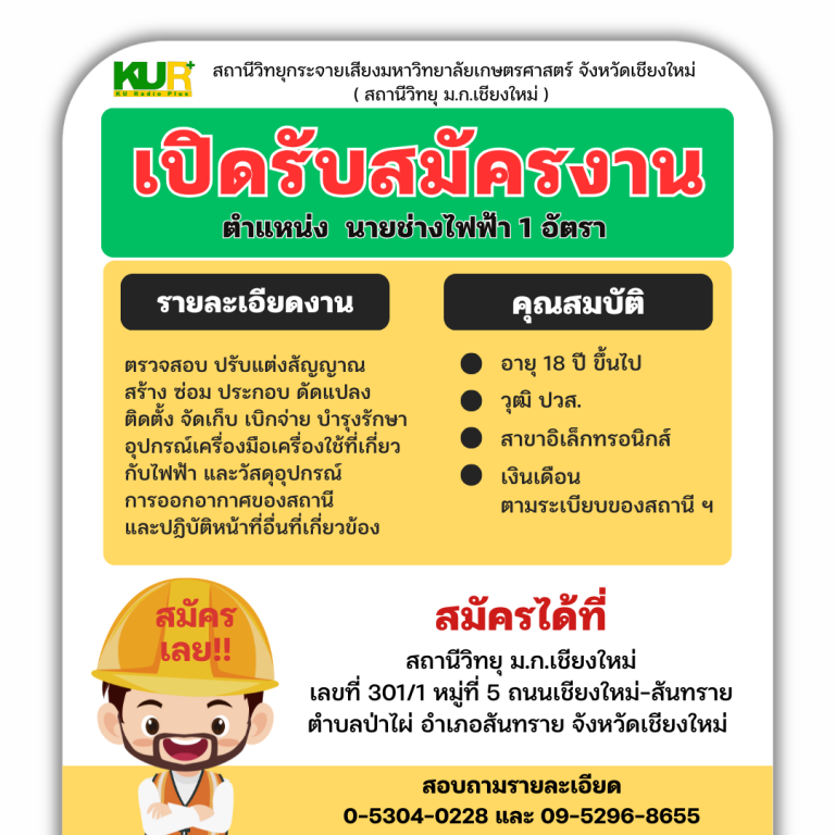 ขยายเวลารับสมัครงาน สถานีวิทยุ ม.ก.เชียงใหม่ รับสมัครนายช่างไฟฟ้า จำนวน 1 อัตรา ถึง วันที่ 21 ธันวาคม 2568 นี้