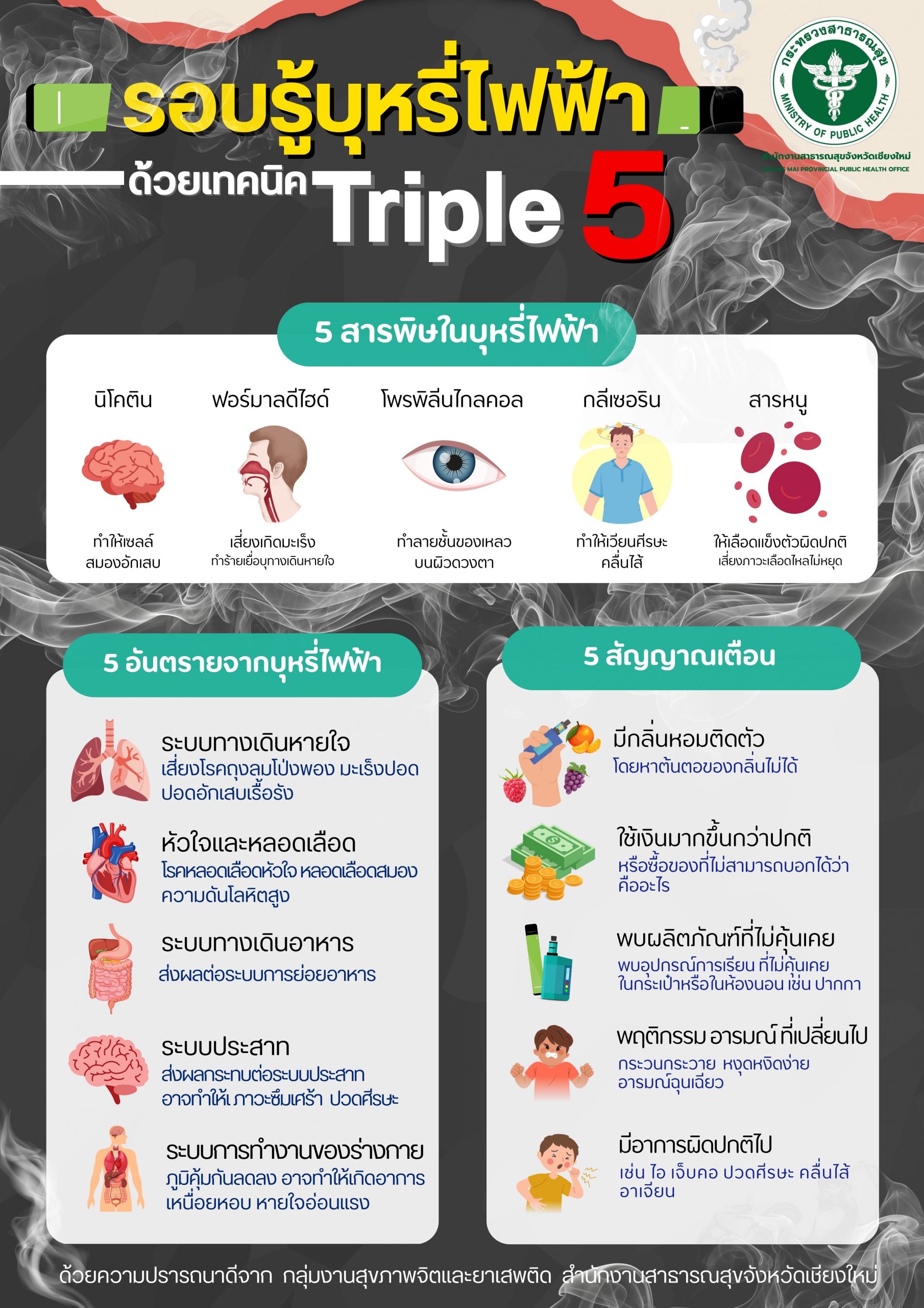 สาธารณสุขจังหวัดเชียงใหม่ เชิญชวนประชาชนร่วมขับเคลื่อนมาตรการ “สังคมไทยปลอดบุหรี่ไฟฟ้า”สร้างความตระหนักรู้ถึงอันตรายด้วยหลัก “Triple Five“ 5 อันตรายจา