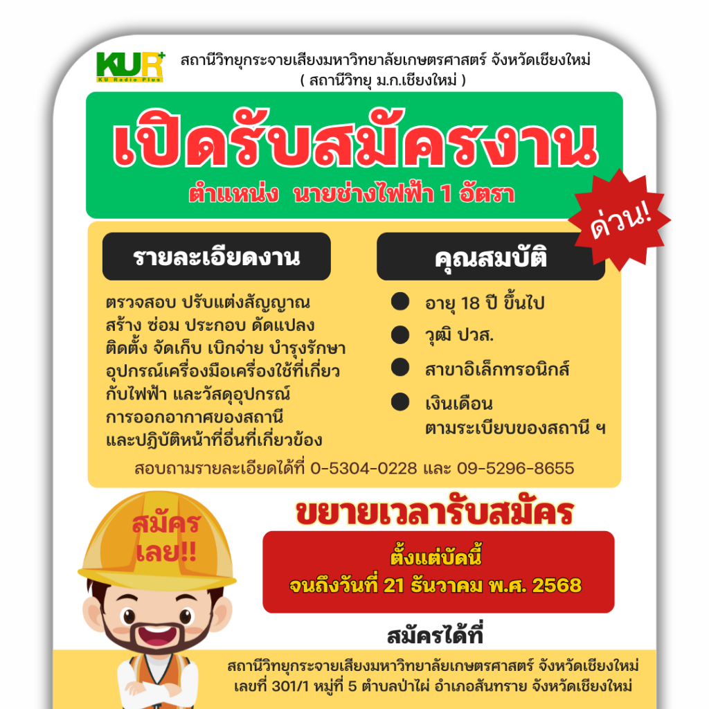 ขยายเวลารับสมัครงาน สถานีวิทยุ ม.ก.เชียงใหม่ รับสมัครนายช่างไฟฟ้า จำนวน 1 อัตรา ถึง วันที่ 21 ธันวาคม 2568 นี้