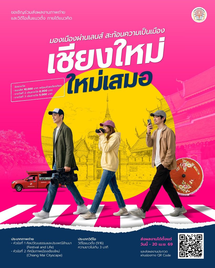 เชียงใหม่ 6 เม.ย.- เทศบาลนครเชียงใหม่ ขอเชิญชวนประชาชน นักเรียน และนักศึกษา ร่วมส่งผลงานเข้าประกวดภาพถ่ายและวิดีโอสั้นแนวตั้ง ภายใต้แนวคิด “มองเมืองผ่านเลนส์ สะท้อนความเป็นเมือง เชียงใหม่ใหม่เสมอ” เพื่อชิงเงินรางวัลมูลค่ารวมกว่า 100,000 บาท