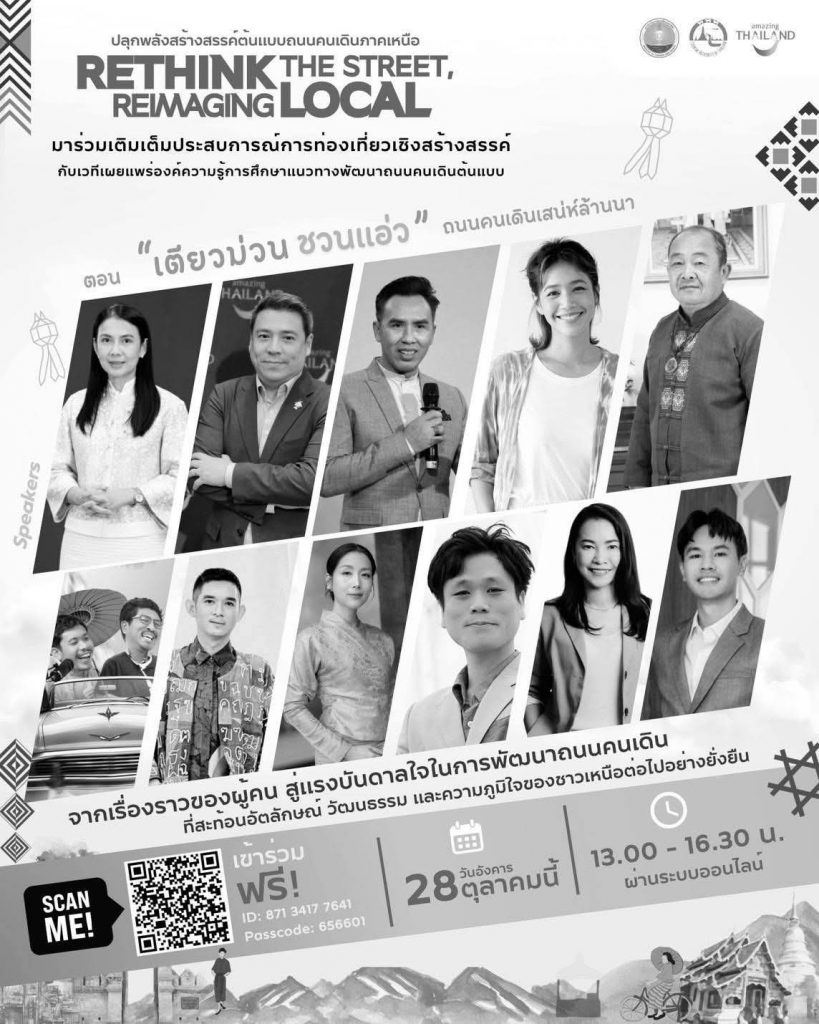 เชียงใหม่ 28 ต.ค.- ที่นิมมาน คอนเวนชั้น เซ็นเตอร์(@Nimman Convention Centre) อำเภอเมืองเชียงใหม่ จังหวัดเชียงใหม่ การท่องเที่ยวแห่งประเทศไทย (ททท.)จัดกิจกรรมเวทีเผยแพร่องค์ความรู้การศึกษาแนวทางการศึกษาแนวทางพัฒนาถนนคนเดินต้นต้นแบบ “เตียวม่วน ชวนแอ่ว ถนนคนเดินล้านนา” ภายใต้แมวคิด Rethink the Street, Reimaging the Local โครงการศึกษาศักยภาพการจัดกิจกรรมท่องเที่ยวย่านถนนคนเดินและสินค้า/บริการทางการท่องเที่ยวเพื่อเป็นต้นแบบในการส่งเสริมการท่องเที่ยวด้วยเศรษฐกิจเชิงสร้างสรรค์ โดยร่วมกับจังหวัดเชียงใหม่ เทศบาลนครเชียงใหม่ เทศบาลตำบลสันกำแพง อำเภอบ้านธิ จังหวัดลำพูนสถาบันการศึกษา ภาคเอกชนและชุมชนท้องถิ่น จัดกิจกรรมดังกล่าวขึ้น เพื่อยกระดับคุณภาพของแหล่งท่องเที่ยว สร้างมูลค่าเพิ่มให้แก่สินค้าเชิงวัฒนธรรม ผ่านอัตลักษณ์ที่โดดเด่น ประสบการณ์อันมีคุณค่า และเรื่องเล่าที่มีความหมายของชุมชนอย่างเป็นระบบ อันนำไปสู่การกระจายตัวและความถี่ในการท่องเที่ยวจากเมืองหลัก สู่เมืองน่าเที่ยวอย่างยั่งยืน