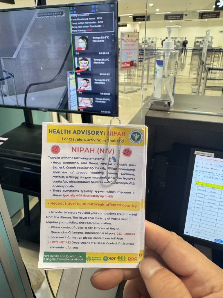 ท่าอากาศยานเชียงใหม่ยกระดับมาตรการคัดกรองผู้โดยสารระหว่างประเทศ เพื่อเฝ้าระวังและป้องกันความเสี่ยงจากโรคติดเชื้อไวรัสนิปาห์ (Nipah Virus)