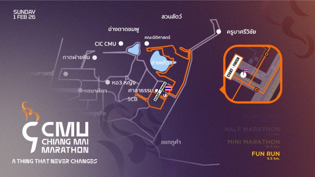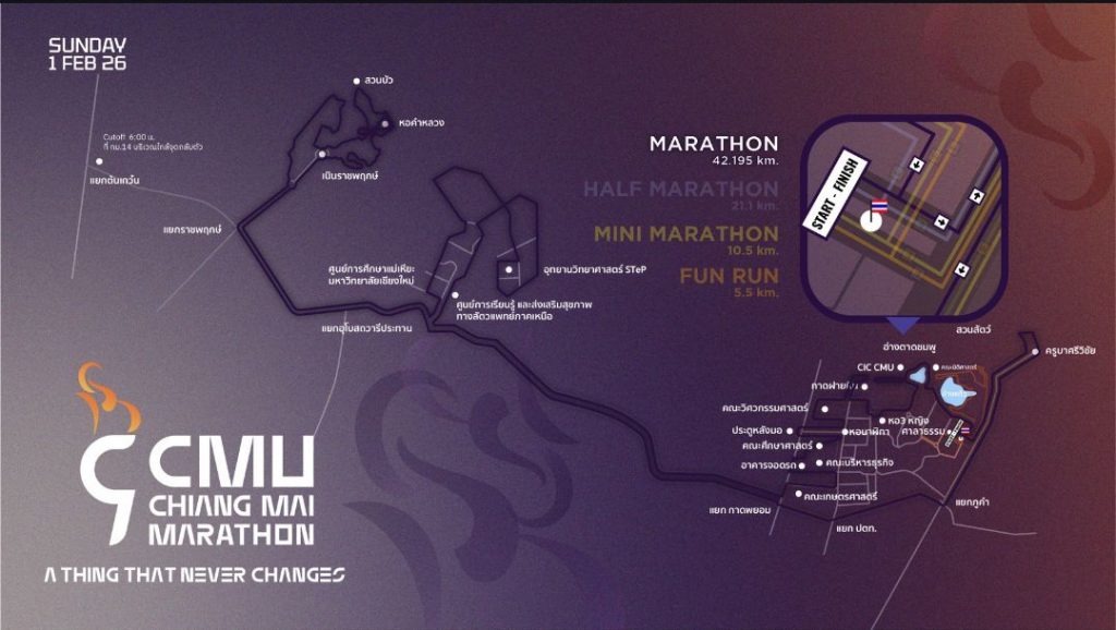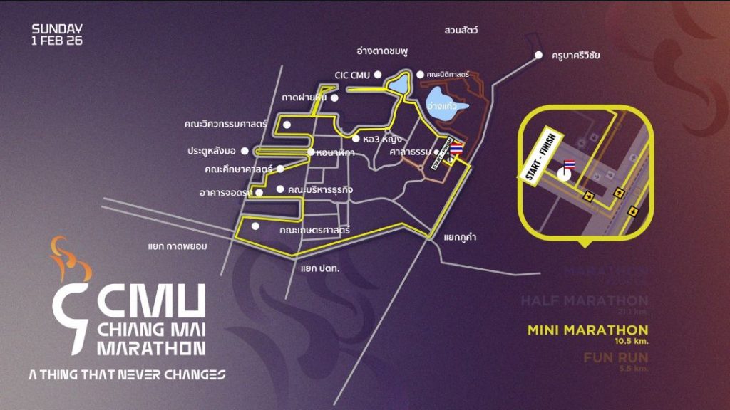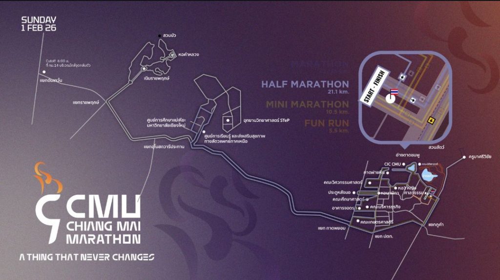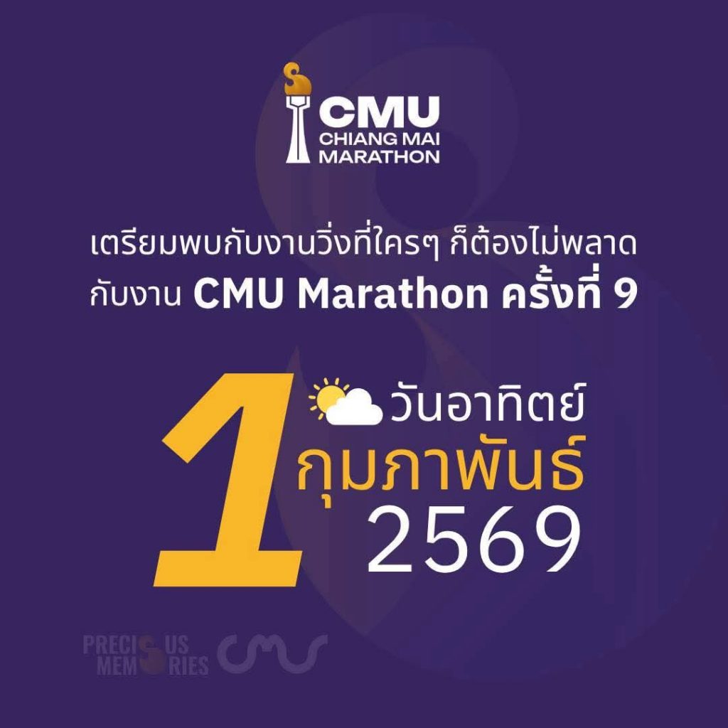 และนักวิ่งทุกท่านที่สนใจเข้าร่วมการแข่งขันการวิ่งการกุศลมหาวิทยาลัยเชียงใหม่ – เชียงใหม่มาราธอน ครั้งที่ 9 (CMU – Chiang Mai Marathon 2026) และขอความอนุเคราะห์ประชาชนโปรดหลีกเลี่ยงเส้นทาง