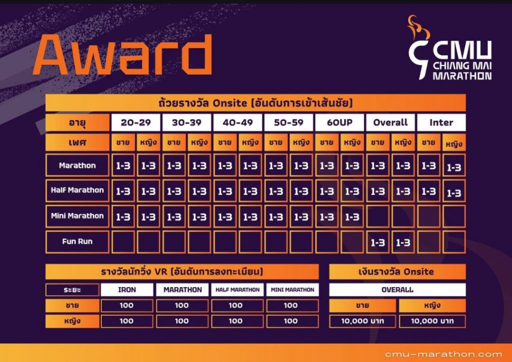 สามารถติดตามรายละเอียดเส้นทางการแข่งขัน สิทธิประโยชน์นักวิ่ง ขั้นตอนการสมัครและข้อมูลสำคัญเพิ่มเติมได้ที่ Facebook Page: CMU Marathon และเว็บไซต์ www.cmu-marathon.com