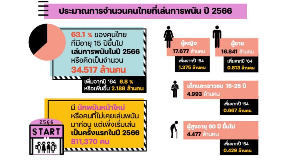 ผลสำรวจพบว่า วงเงินหมุนเวียนจากการพนันในปี 2566 สูงถึง 1.014 ล้านล้านบาท โดย “พนันบอล” มีเงินสะพัดมากที่สุดถึง 270,415 ล้านบาท เพิ่มขึ้นจากปี 2564 ถึง 49.3% รองลงมาคือ “หวยใต้ดิน” 164,069 ล้านบาท และ “สลากกินแบ่งรัฐบาล” 160,239 ล้านบาท มีข้อสังเกตว่า “สล็อตแมชชีนออนไลน์” มีการเติบโตสูงถึง 647.2% จากปีที่ผ่านมา สะท้อนถึงการเปลี่ยนผ่านสู่การพนันออนไลน์อย่างรวดเร็วและไม่สามารถแก้ไขได้ง่ายเนื่องจากข้อจำกัดเรื่องระบบ เครื่องมืออุปกรณ์ เทคโนโลยีต่างๆ ที่แยบยลมากขึ้น