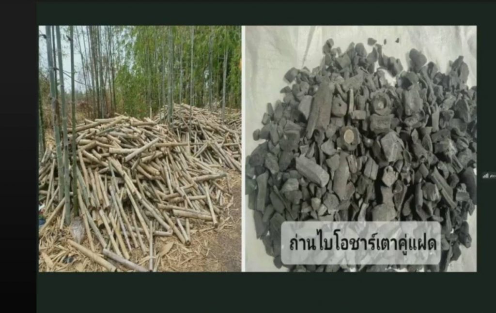 “การผลิตไบโอชาร์นั้นก็ได้แนะนำให้เกษตรกรนำเศษวัสดุเหลือใช้จากการปลูกพืชในแต่ละชนิดมาผลิตเป็นถ่านไบโอชาร์ ซึ่งจะสามารถลดเศษวัสดุเหลือทิ้งได้ ไม่ว่าดินแบบไหนตัวไบโอชาร์ก็มีประโยชน์ ถ้าเราใส่ปุ๋ยลงไป 100 กิโล ฝนตกมาเหลือ 60 ถ้าใส่ไบโอชาร์ปุ๋ยก็จะไม่หายไปไหน ช่วยกักเก็บความชื้นด้วยลดการชะล้าง ใช้ได้ทุกประเภทดิน”อาจารย์คนเดิมระบุ