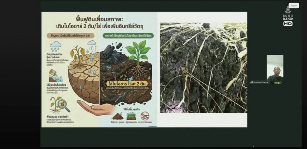 “ไบโอชาร์ไม่ใช่ปุ๋ย แต่ใส่เพื่อบำรุงดินโดยใช้ร่วมกับปุ๋ยเคมีให้เหมาะกับการปลูกพืชมากขึ้น และลดการใช้ปุ๋ยส่วนเกินลงเพื่อประหยัดต้นทุน เพราะไบโอชาร์จะช่วยเพิ่มความชื้นในดิน ทำให้ดินมีรูพรุนเยอะช่วยส่งเสริมการเจริญของเชื้อราไมคอไรซาและจุลินทรีย์ที่ตรึงไนโตรเจนป้องกันการชะล้างปุ๋ยและธาตุอาหารในดิน” อาจารย์ผู้เชี่ยวชาญด้านดินและปุ๋ยระบุ