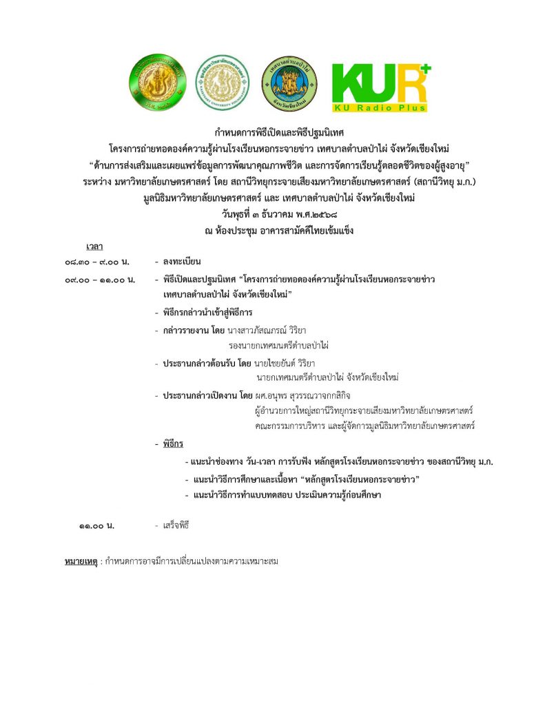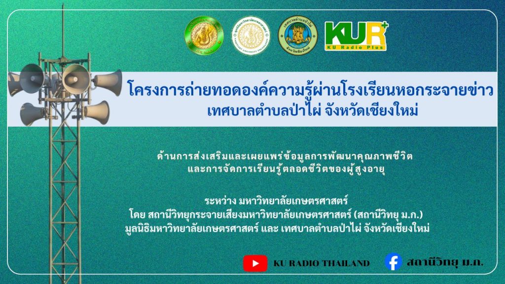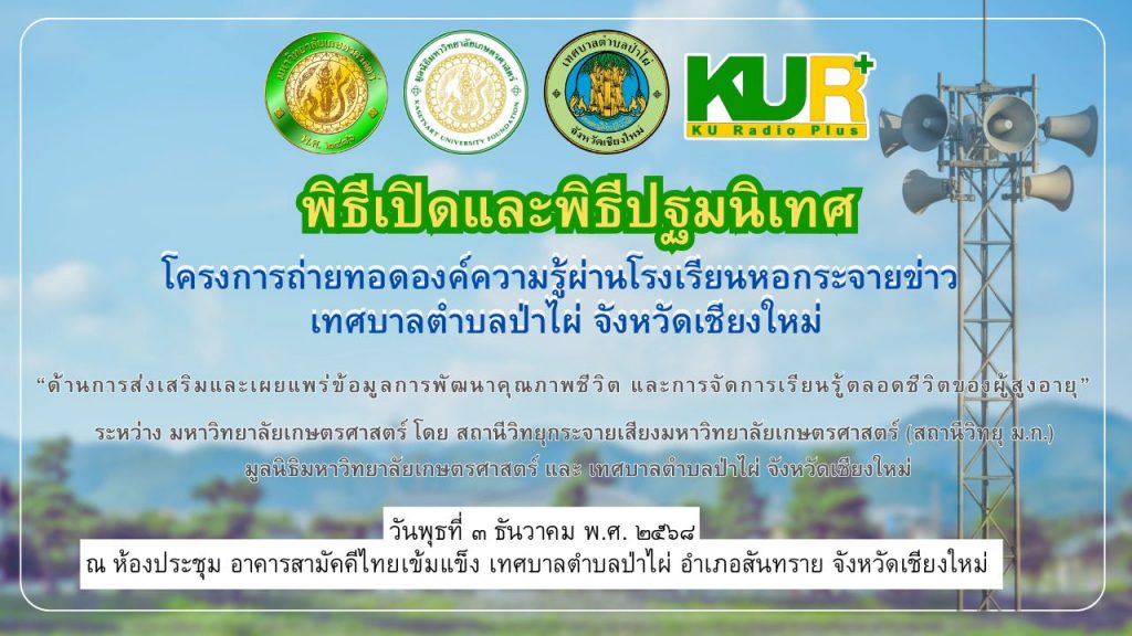 จากผลสำเร็จดังกล่าวก็ได้มีการต่อยอดความร่วมมือภายใต้ MOU ร่วมกันในภารกิจร่วมพัฒนาคุณภาพชีวิตของประชาชน ทางมหาวิทยาลัยเกษตรศาสตร์โดยมูลนิธิฯ และสถานีวิทยุมหาวิทยาลัยเกษตรศาสตร์ จึงได้จัดทำโครงการถ่ายทอดองค์ความรู้ผ่านโรงเรียนหอกระจายข่าว ร่วมกับเทศบาลตำบลป่าไผ่ จังหวัดเชียงใหม่ มีวัตถุประสงค์สำคัญในด้านการส่งเสริมและเผยแพร่ข้อมูลการพัฒนาคุณภาพชีวิตและการจัดการเรียนรู้ตลอดชีวิตของผู้สูงอายุ โดยจะมีการเปิดโครงการในวันพุธที่ 3 ธันวาคม พ.ศ.2568 นี้ ที่ห้องประชุม อาคารสามัคคีไทยเข้มแข็ง เทศบาลตำบลป่าไผ่ พร้อมการปฐมนิเทศ “โครงการถ่ายทอดองค์ความรู้ผ่านโรงเรียนหอกระจายข่าว เทศบาลตำบลป่าไผ่ จังหวัดเชียงใหม่” กับกลุ่มเป้าหมายใน 3 หมู่บ้านต้นแบบของตำบลป่าไผ่ ซึ่งเป็นพื้นที่นำร่องแรกก่อนจะขยายผลไปยังพื้นที่อื่นๆ ทั้ง 4 ภูมิภาคต่อไป.