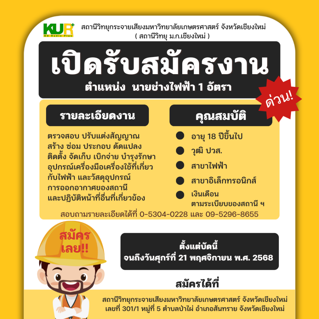 สถานีวิทยุกระจายเสียงมหาวิทยาลัยเกษตรศาสตร์ จังหวัดเชียงใหม่ (สถานีวิทยุ ม.ก.เชียงใหม่) รับสมัครบุคคลเพื่อคัดเลือกเป็น ลูกจ้างชั่วคราว