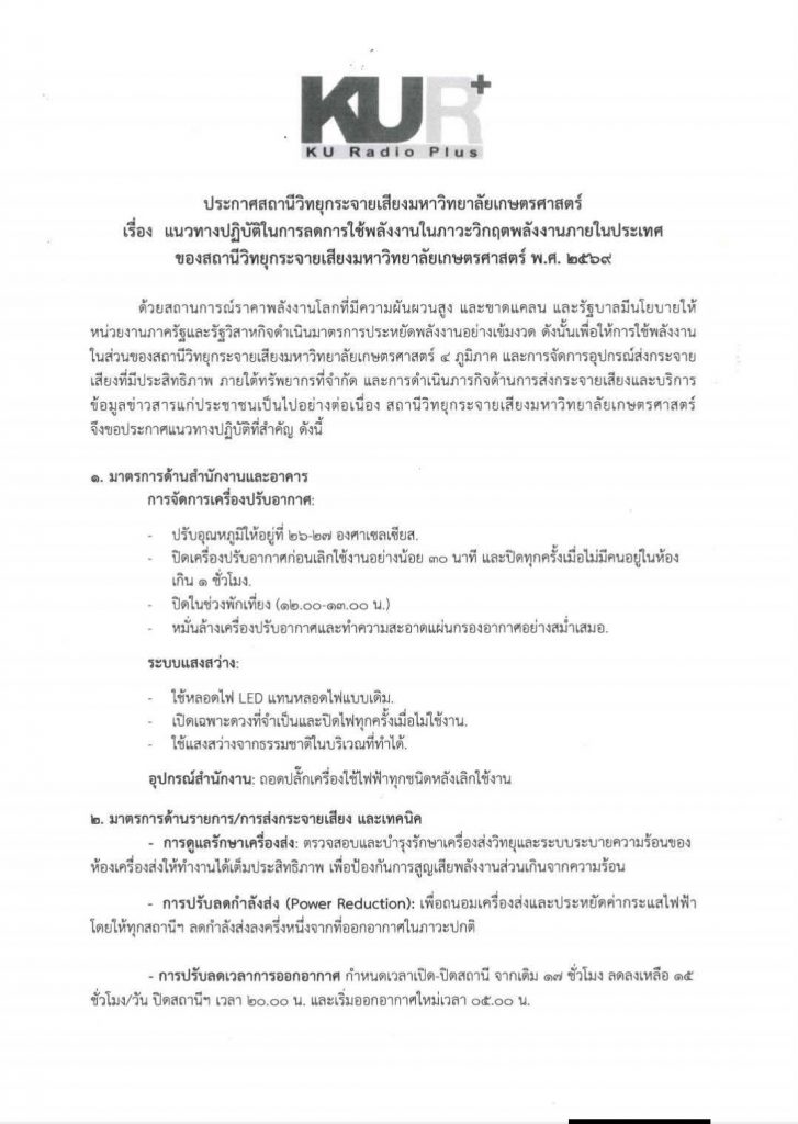 จากสถานการณ์ปัจจุบัน สถานีวิทยุ ม.ก. ให้ความสำคัญเรื่องของการลดการใช้พลังงานในภาวะวิกฤตพลังงานภายในประเทศ อย่างที่สุด