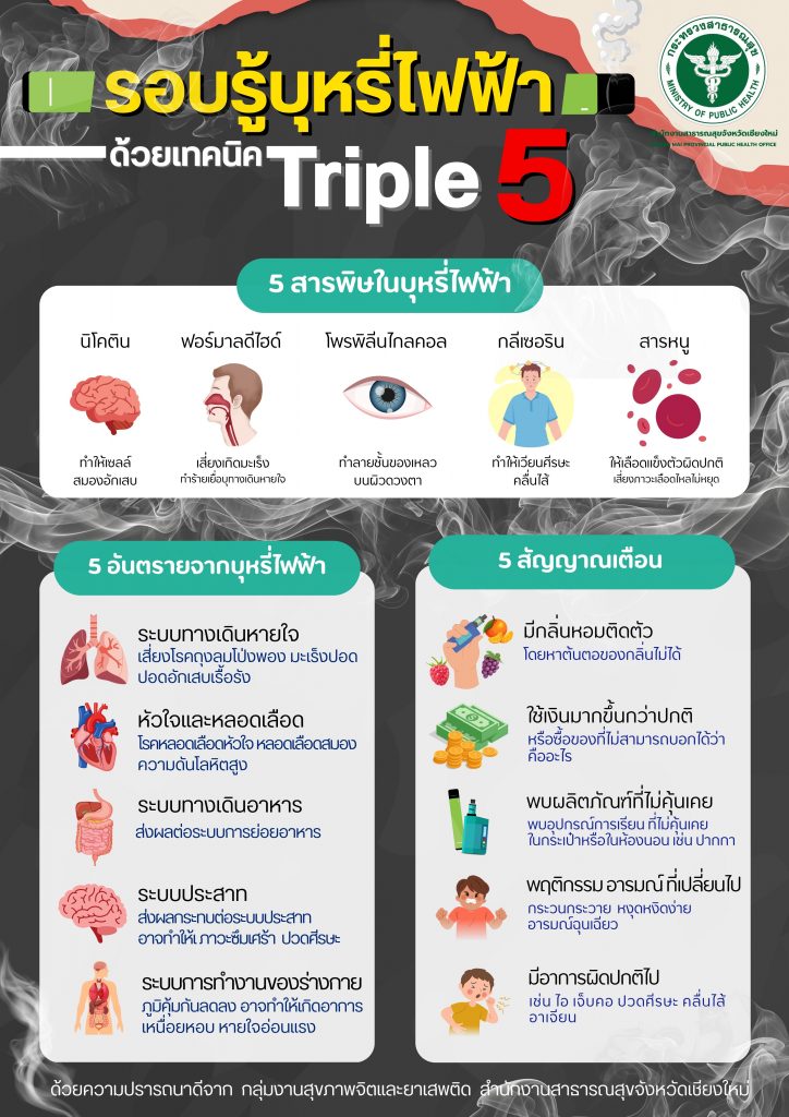 สำหรับหลัก “Triple Five“ 5 อันตรายจากบุหรี่ไฟฟ้า 5 สารพิษในบุหรี่ไฟฟ้า และ 5 สัญญาณเตือนว่าลูกหลานติดบุหรี่ไฟฟ้า โดย 5 อันตรายจากบุหรี่ไฟฟ้า บุหรี่ไฟฟ้า (Electronic Cigarette) หรือที่เรียกกันอีกชื่อหนึ่งว่า Vape คืออุปกรณ์ที่ใช้ในการสูบบุหรี่ที่ใช้พลังงานจากแบตเตอรี่เพื่อสร้างความร้อนและสร้างสารในไอระเหยที่ผู้ใช้สูบเข้าไปในปอด ปัจจุบันบุหรี่ไฟฟ้าถือเป็นสินค้าผิดกฎหมาย มีความผิดทั้งผู้นำเข้า ผู้ขายและผู้ใช้ บุหรี่ไฟฟ้ามีอันตรายและส่งผลกระทบต่อระบบต่างๆ ในร่างกาย ที่สำคัญ ดังนี้