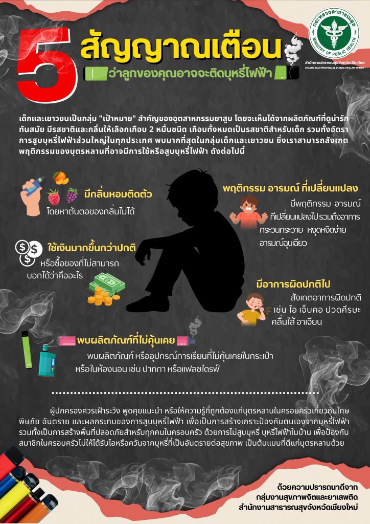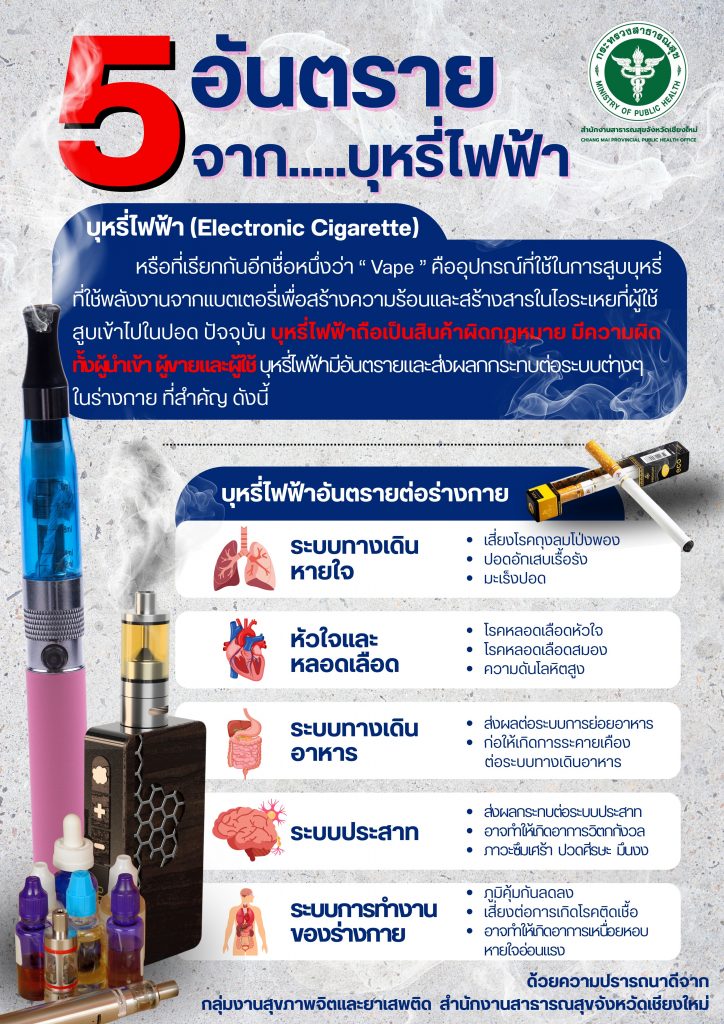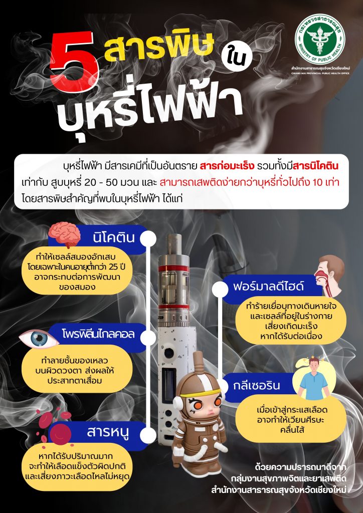 สาธารณสุขจังหวัดเชียงใหม่ เชิญชวนประชาชนร่วมขับเคลื่อนมาตรการ “สังคมไทยปลอดบุหรี่ไฟฟ้า”สร้างความตระหนักรู้ถึงอันตรายด้วยหลัก “Triple Five“ 5 อันตรายจากบุหรี่ไฟฟ้า 5 สารพิษในบุหรี่ไฟฟ้า และ 5 สัญญาณเตือนว่าลูกหลานติดบุหรี่ไฟฟ้า