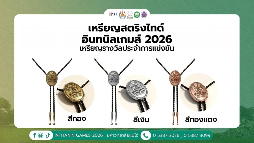 ไฮไลต์สำคัญของ อินทนิลเกมส์ 2026 ในครั้งนี้ เราได้สร้างอัตลักษณ์ใหม่ให้รูปแบบของเหรียญกีฬาสำหรับการแข่งขันเป็นแบบ สตริงไทด์ มีสามสี สีทอง สีเงิน และทองแดง นอกจากความภาคภูมิใจในการเข้าร่วมแข่งขันกีฬาระดับประเทศในครั้งนี้แล้ว ยังสามารถนำไปใช้สวมเป็นเครื่องแต่งกายแทนเนคไทเป็นสัญลักษณ์หนึ่งของความเป็นคาวบอยแม่โจ้ ที่มีความแข็งแกร่ง อดทน สู้งาน ได้ด้วยครับ ถือเป็นที่ระลึกจาก อินทนิลเกมส์ 2026 มหาวิทยาลัยแม่โจ้ The Home of Cowboys