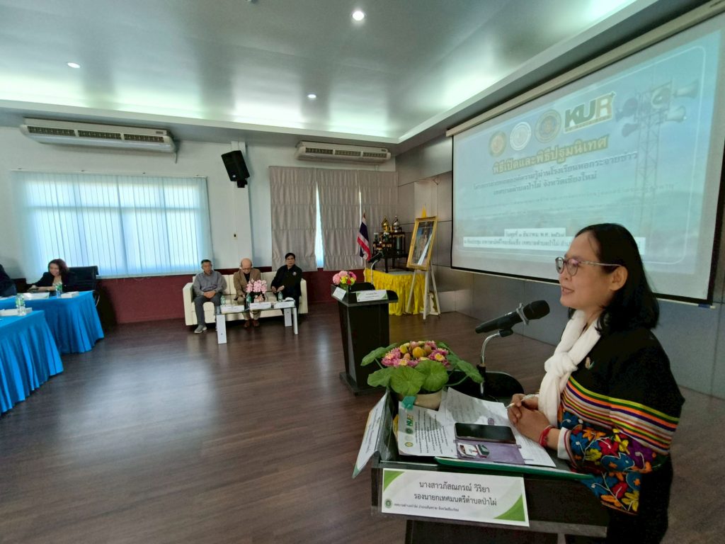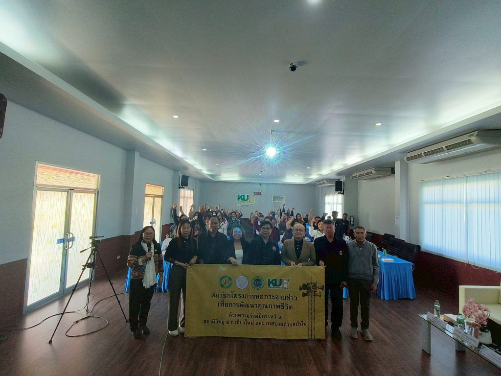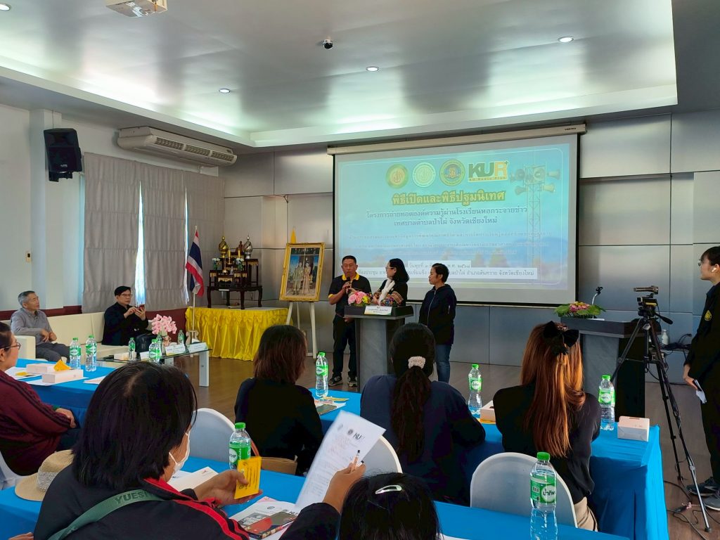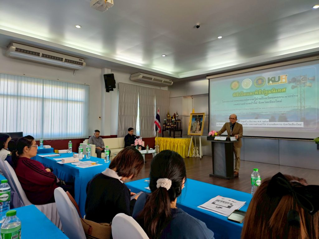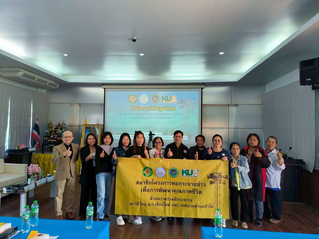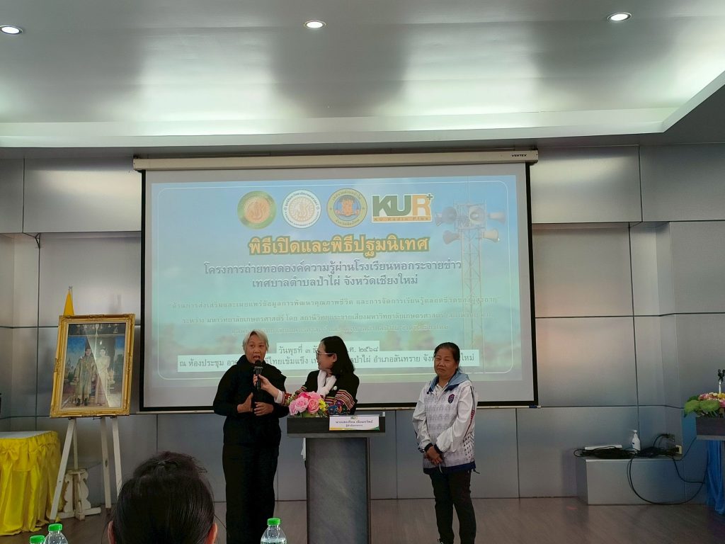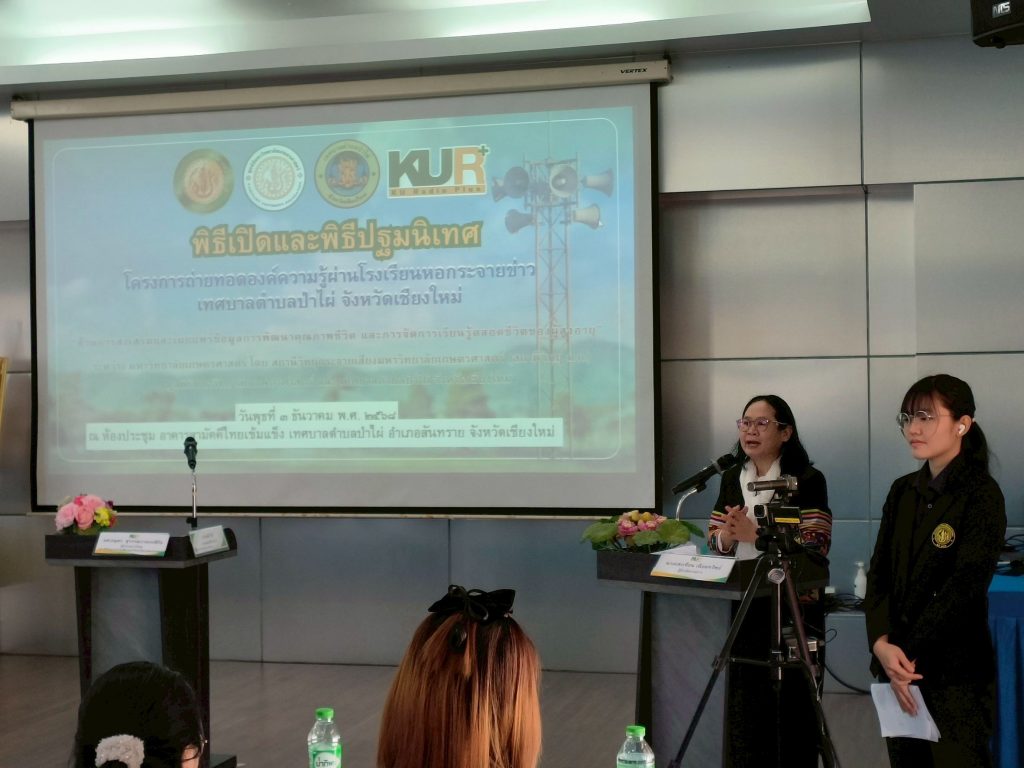 เชียงใหม่ 3 ธ.ค.- ที่ห้องประชุมเทศบาลตำบลป่าไผ่ อำเภอสันทราย จังหวัดเชียงใหม่ ผศ.อนุพร สุวรรณวาจกกสิกิจ ผู้อำนวยการใหญ่สถานีวิทยุกระจายเสียงมหาวิทยาลัยเกษตรศาสตร์ ในฐานะกรรมการบริหารและผู้จัดการมูลนิธิมหาวิทยาลัยเกษตรศาสตร์ พร้อมด้วย นายไชยยันต์ วิริยา นายกเทศมนตรีตำบลป่าไผ่ ร่วมกันเปิดโครงการถ่ายทอดองค์ความรู้ผ่านโรงเรียนหอกระจายข่าวภายใต้“โครงการถ่ายทอดองค์ความรู้ผ่านโรงเรียนหอกระจายข่าว เทศบาลตำบลป่าไผ่ จังหวัดเชียงใหม่” กับกลุ่มเป้าหมายใน 3 หมู่บ้านต้นแบบของตำบลป่าไผ่จำนวน 50 คน ซึ่งเป็นพื้นที่นำร่องแรกก่อนจะขยายผลไปยังพื้นที่อื่นๆ ทั้ง 4 ภูมิภาคต่อไป ทั้งนี้เพื่อขยายรูปแบบและพัฒนามาจากโครงการโรงเรียนผู้สูงอายุทางอากาศ เพื่อสร้างแรงจูงใจและกระตุ้นให้ประชาชนกลุ่มเป้าหมายตระหนักถึงความจำเป็นในการพัฒนาตนเอง การดูแล การพัฒนาคุณภาพชีวิต รวมถึงการส่งเสริมสุขภาพที่ดีของตนเองทั้งร่างกายและจิตใจ โดยมีนางสาวภัสณภรณ์ วิริยา รองนายกเทศมนตรีตำบลป่าไผ่กล่าวรายงานถึงวัตถุประสงค์ความร่วมมือในโครงการ นายสกุล มูลคำ คณะทำงานภาคประชาชนสถานีวิทยุ ม.ก.เชียงใหม่ พร้อมคณะบริหาร ผู้อำนวยการกองศึกษา เจ้าหน้าที่เทศบาลฯเข้าร่วมในพิธี และก่อนทำพิธีเปิดโครงการ ได้ร่วมกันถวายความอาลัยแด่สมเด็จพระนางเจ้าสิริกิติ์ พระบรมราชินีนาถพระบรมราชชนนีพันปีหลวง เพื่อร่วมการแสดงออกถึงความจงรักภักดี สำนึกในพระมหากรุณาธิคุณอันหาที่สุดมิได้