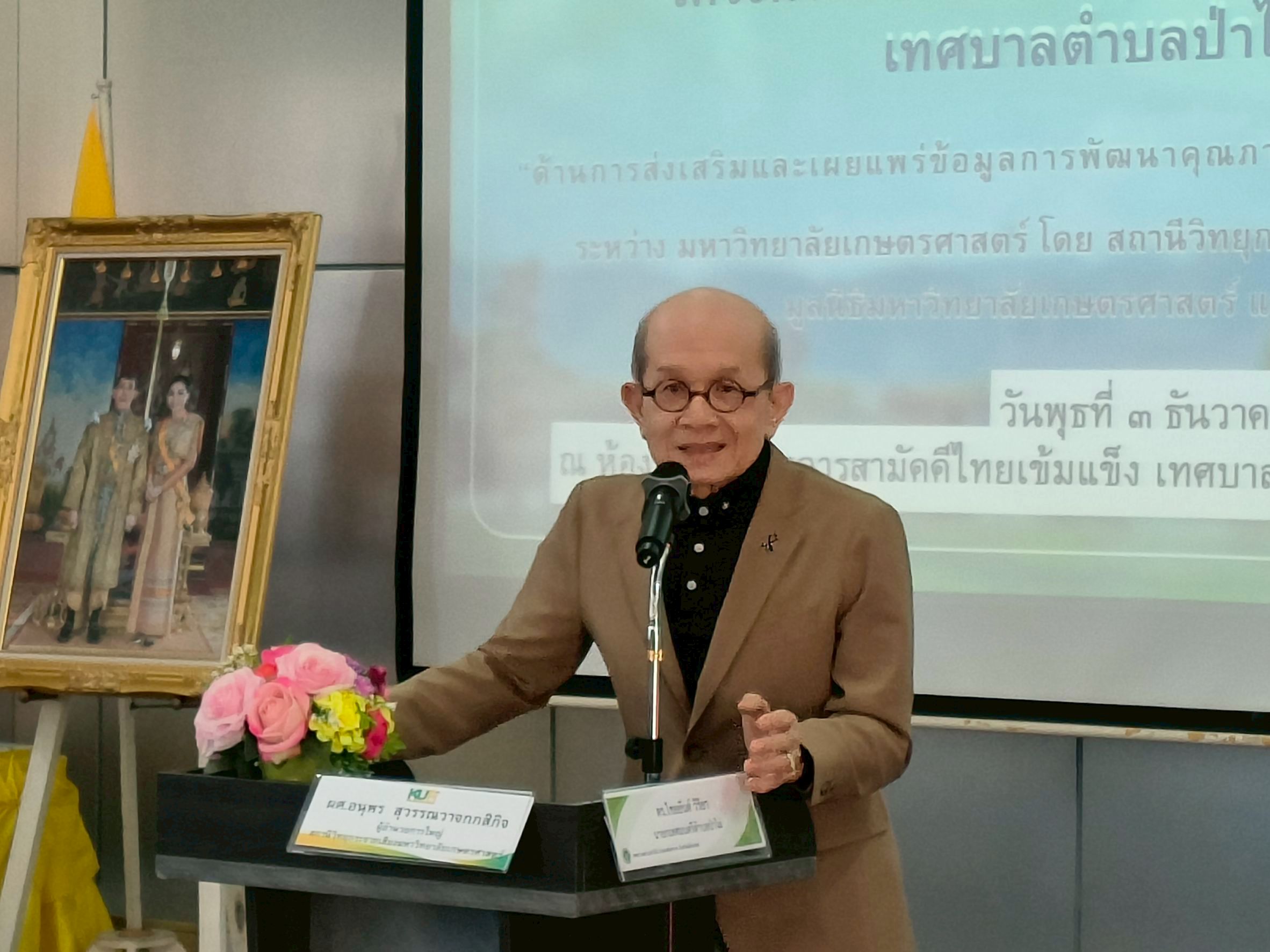 โอกาสนี้ ผศ.อนุพร เปิดเผยว่า จากการทำงานในนิยามของสถานีฯ คือ “สถานีวิทยุ ม.ก. สถานีวิทยุเพื่อการเกษตร ภาษา วัฒนธรรม และบริการสาธารณะ” ด้วยการสร้างสรรค์เนื้อหาในด้าน “พัฒนาคุณภาพชีวิต” มาโดยตลอด โดยนำศาสตร์สาขาการเกษตร ทั้งภายในมหาวิทยาลัยเกษตรศาสตร์ที่เป็นงานบริการวิชาการแก่สังคมออกเผยแพร่ในรูปแบบต่าง ๆ รวมทั้งการนำองค์ความรู้จากหน่วยงานภายนอกมาผลิตรายการร่วมกัน ทางสถานีวิทยุ ม.ก. ได้จัดตั้ง “โรงเรียนทางอากาศ” ในหลักสูตรมีการจัดระบบประเมินผล เมื่อเรียนจบหลักสูตร ผู้เรียนที่ผ่านการอบรมจะได้รับประกาศนียบัตรจากมหาวิทยาลัยเกษตรศาสตร์ด้วยและในปี 2567 สถานีวิทยุ ม.ก. ได้ดำเนินการจัดทำโครงการต้นแบบหอกระจายข่าวเพื่อพัฒนาคุณภาพชีวิตที่ดีขึ้นแก่เกษตรกร ภาคตะวันออกเฉียงเหนือ จังหวัดขอนแก่น ร่วมกับ กรมพัฒนาที่ดินและจัดทำโครงการเกษตรภิรมย์ที่ปลายแห่งชีวิต นำร่องในภาคเหนือ ด้วยการแจกเมล็ดพันธุ์พืชให้กับกลุ่มผู้สูงวัยและโรงเรียนในเครือข่ายของสถานีวิทยุ ม.ก.เชียงใหม่ ในด้านภาษาและวัฒนธรรม สถานีวิทยุ ม.ก. ได้ทำหน้าที่ในการอนุรักษ์ภาษาไทยภายใต้โครงการ “รู้ รัก ภาษาไทย” ร่วมกับ สำนักงานราชบัณฑิตยสภา ตั้งแต่ปี 2544 ถึงปัจจุบัน ในรูปแบบการผลิตเนื้อหาด้านภาษาไทย ภาษาถิ่น 4 ภูมิภาค โรงเรียนผู้สูงอายุทางอากาศต้นแบบที่เทศบาลเมืองแม่เหียะที่ได้รับรางวัลพระปกเกล้าฯและยังมีโครงการความร่วมมือต่างๆกับหลายหน่วยงานอย่างต่อเนื่องที่จะส่งองค์ความรู้ในทุกแพลตฟอร์ม เพื่อสร้างสรรค์สังคม โครงการนำร่องโรงเรียนทางอากาศผ่านหอกระจายข่าวเพื่อคุณภาพชีวิตผู้สูงอายุครั้งนี้เป็นแห่งแรกของประเทศ ที่สานต่อความร่วมมือภายใต้ mou ร่วมกันกับเทศบาลตำบลป่าไผ่อีกโครงการฯ หนึ่ง โดยมีเนื้อหาเรียนรู้จำนวน 25 ตอนติดต่อกันทุกสัปดาห์ มีการวัดผลทั้งก่อนและหลังการเรียนรู้พร้อมมอบใบประกาศนียบัตรจากมหาวิทยาลัยเกษตรศาสตร์ต่อไป