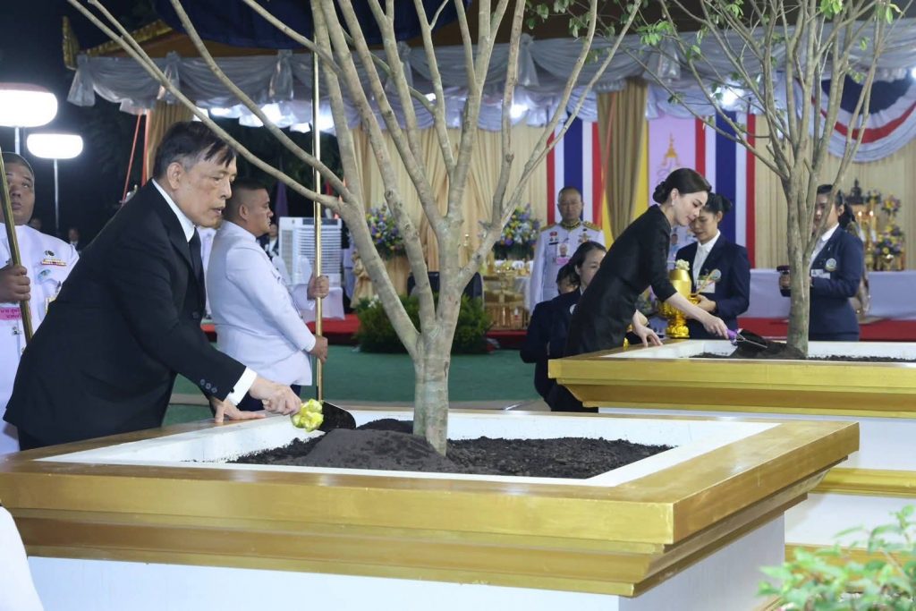 เสร็จแล้ว พระราชทานพระบรมราชวโรกาสให้ เลขาธิการและประธานกรรมการบริหารมูลนิธิโครงการหลวง กราบบังคมทูลเบิกผู้ให้การสนับสนุนการก่อสร้างอาคารเรียนรู้เฉลิมพระเกียรติ 72 พรรษา เฝ้าทูลละอองธุลีพระบาท รับพระราชทานของที่ระลึก ตามลำดับ และพระราชทานพระบรมราชวโรกาสให้ นายนาวิน สุขเลิศ หัวหน้าฝ่ายบริหารผลิตผลและผลิตภัณฑ์ เฝ้าทูลละอองธุลีพระบาท ทูลเกล้าทูลกระหม่อมถวายแผ่นศิลา เพื่อทรงลงพระปรมาภิไธย และพระนามาภิไธย จากนั้น เสด็จพระราชดำเนินไปทรงกราบที่หน้าเครื่องนมัสการ ทรงลาพระสงฆ์ แล้วเสด็จออกจากพลับพลาพิธี เสด็จพระราชดำเนินไปทรงปลูกต้นรวงผึ้ง ไว้เป็นที่ระลึก